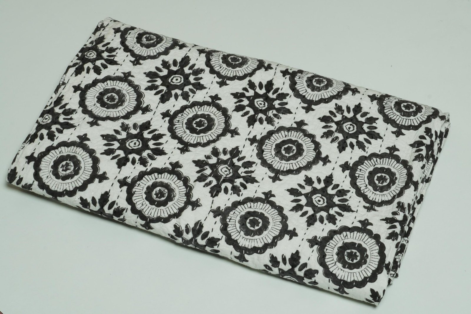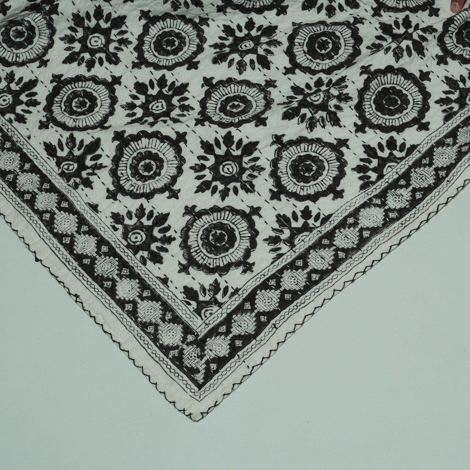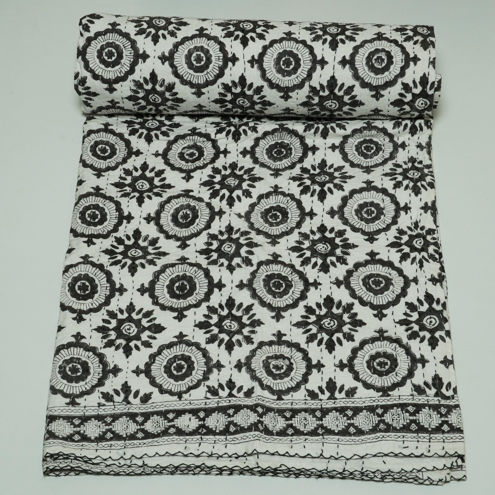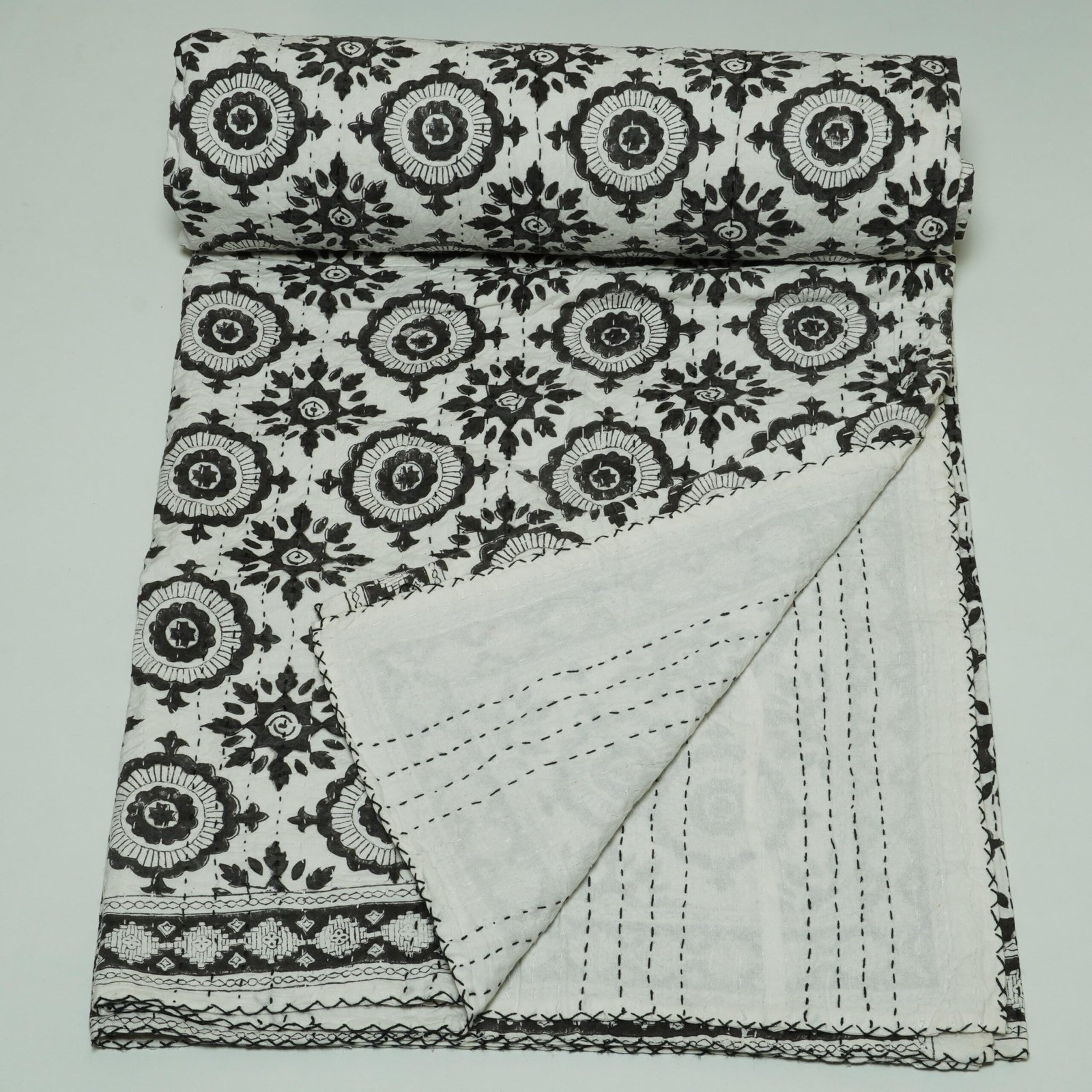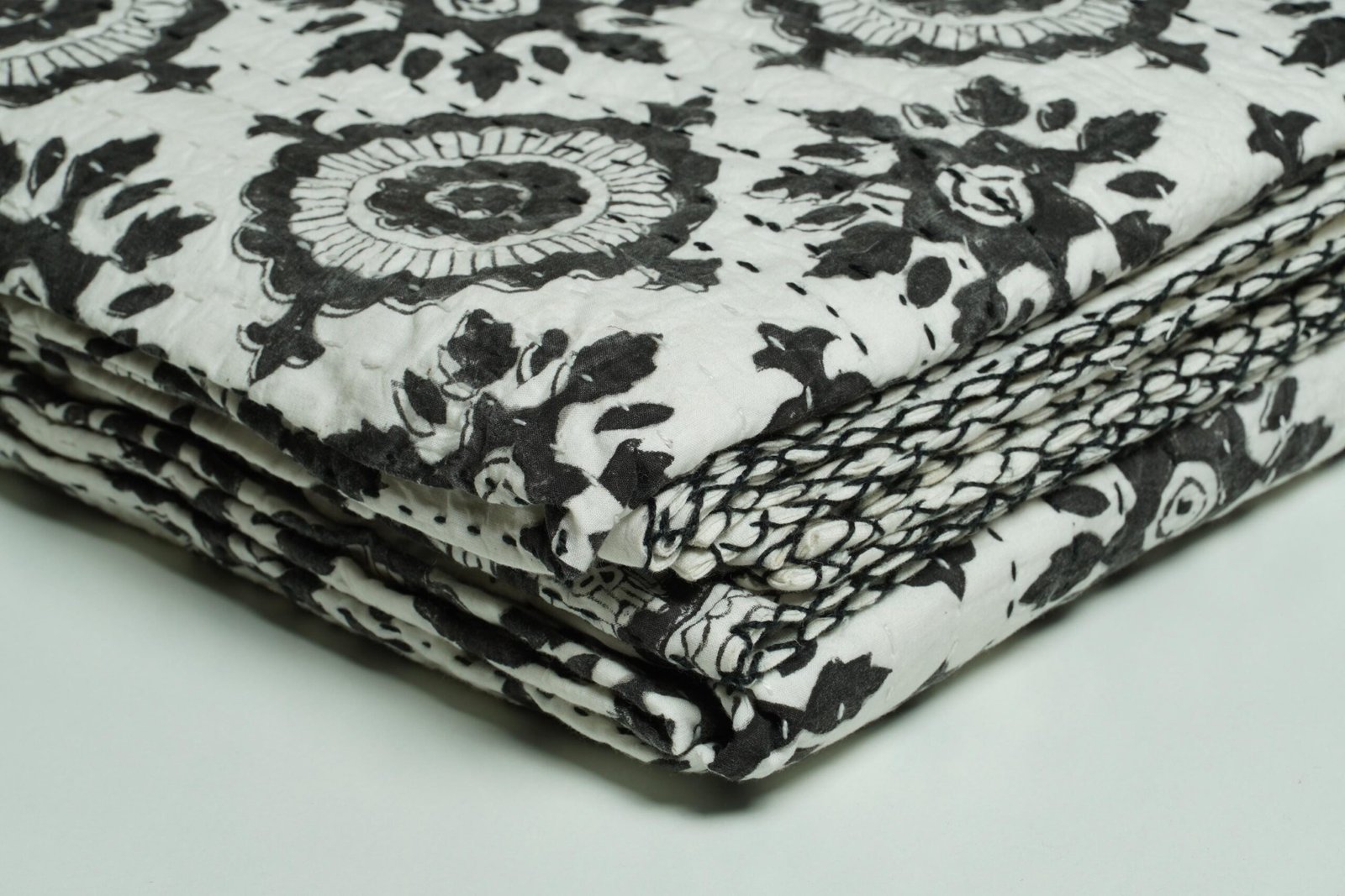 Block Print Kantha Quilt Black & White Floral