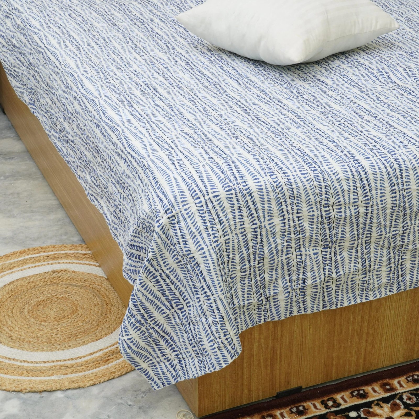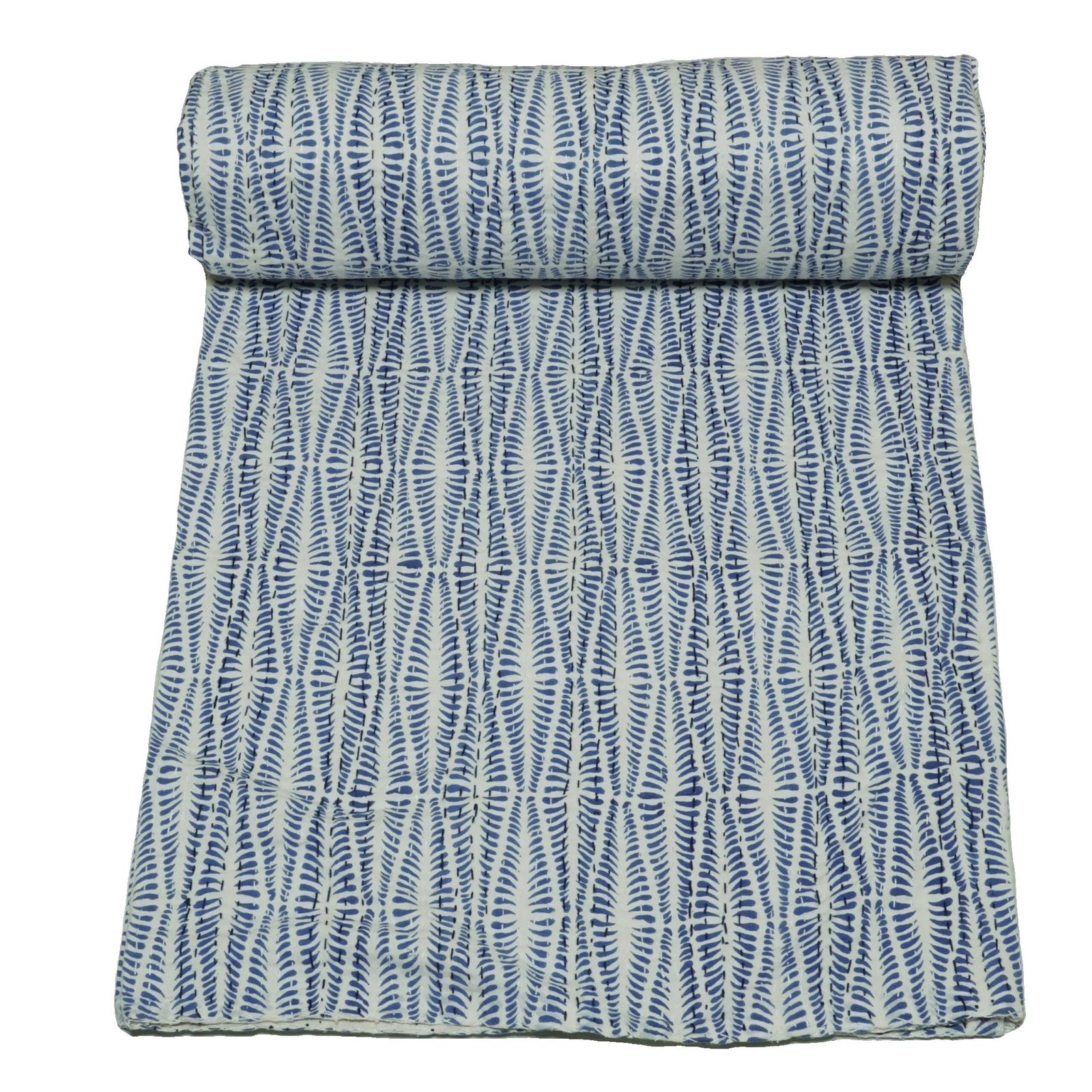 Blue White Block Print Indian Pure Kantha Quilt