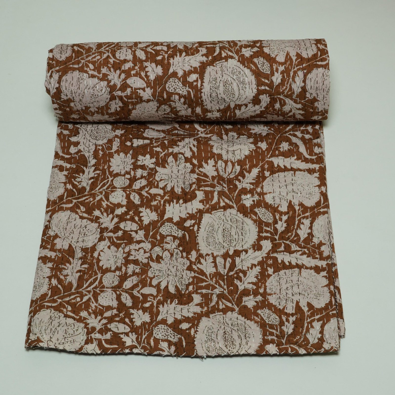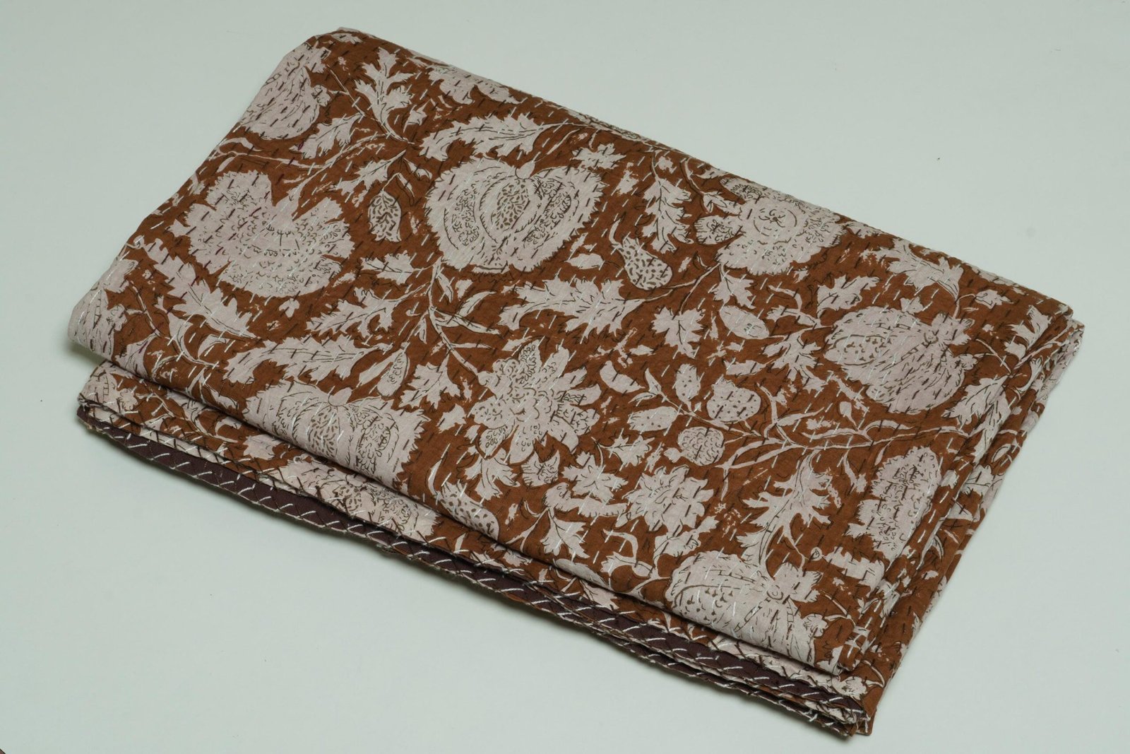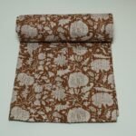Brown Floral Kantha Quilt Handmade Cotton Block Print Boho Bedspread Throw Blanket, cozy, and perfect as a bedspread or decorative throw.
