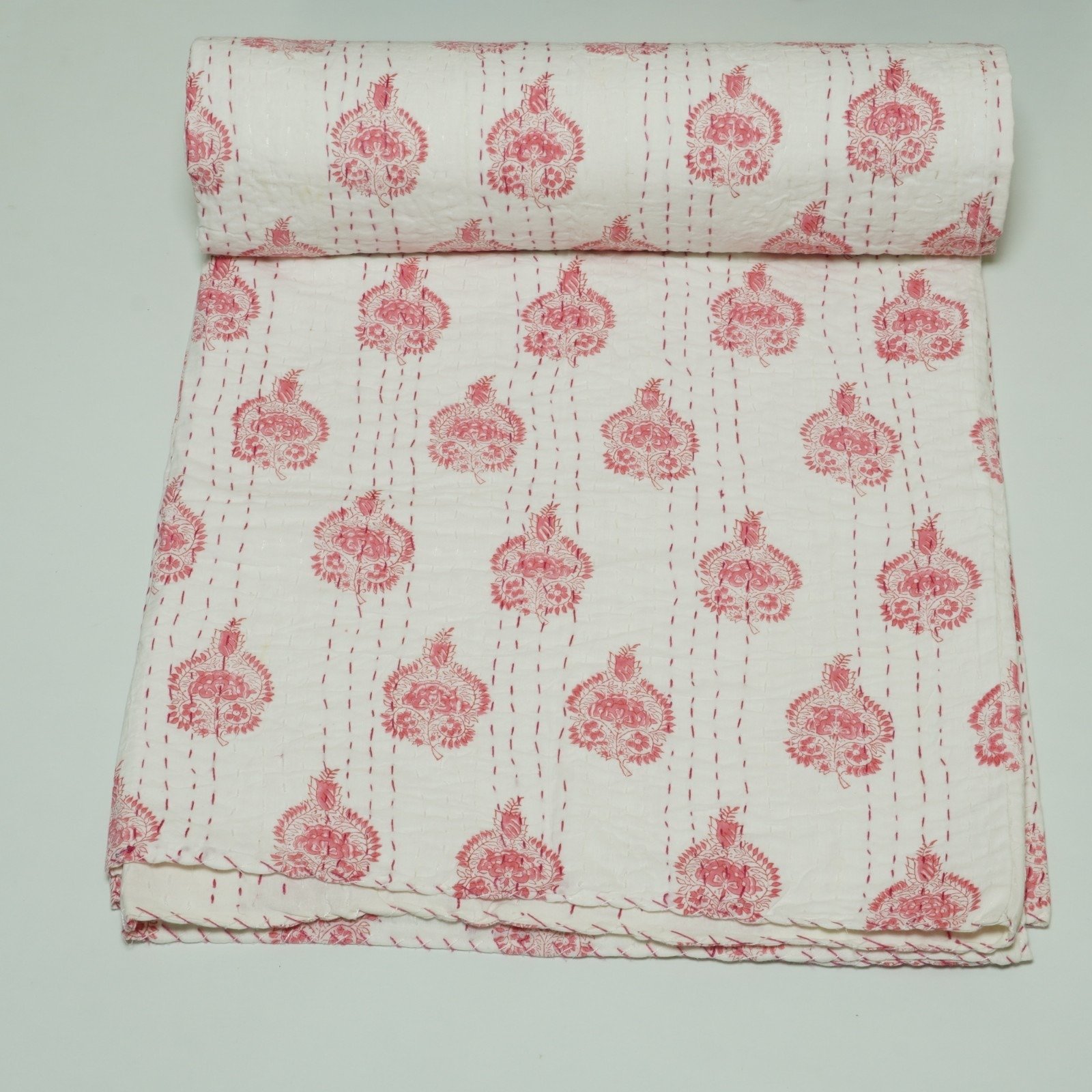 Cotton Block Print Bedspread Handblock Pink Floral Kantha Quilt Queen Soft, and perfect as a bedspread or decorative throw.