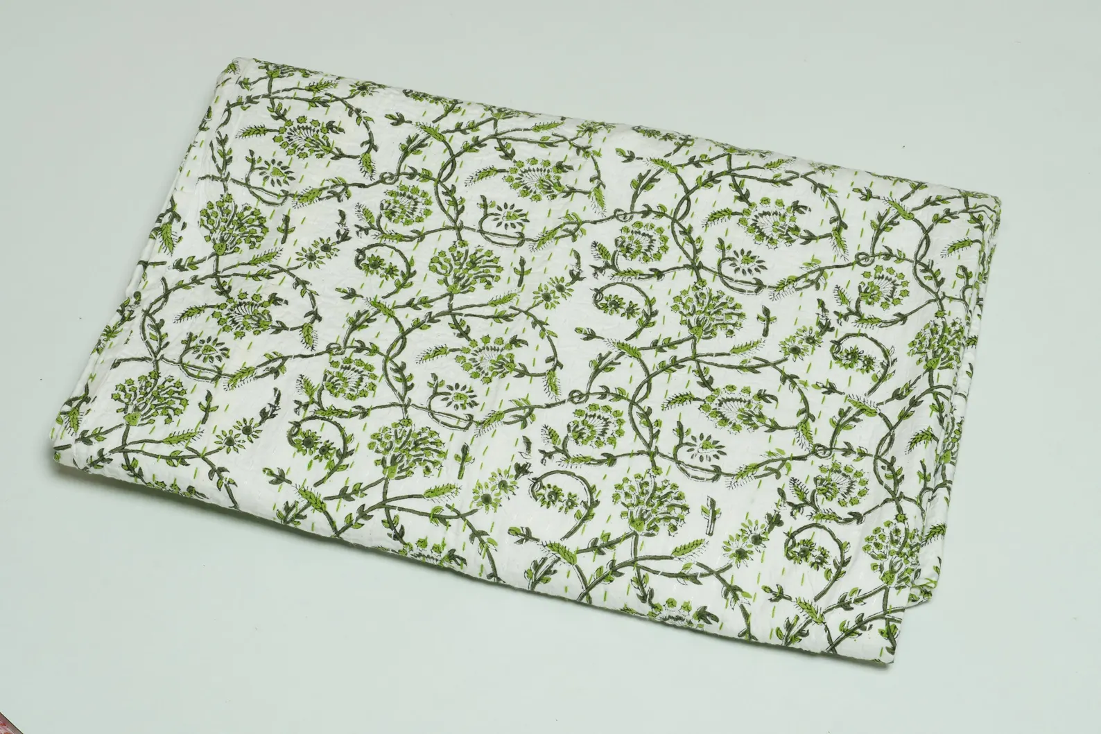 Bring timeless Indian craftsmanship into your home with this beautiful handmade Green Floral Block Print Kantha Quilt.