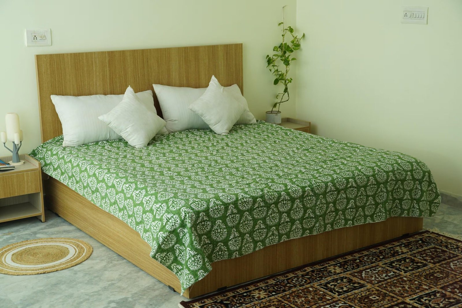 Green Floral Block Print Kantha Quilt | Handmade Indian Cotton Bedspread A lightweight, breathable bedspread perfect for boho, natural, and cozy bedroom décor.