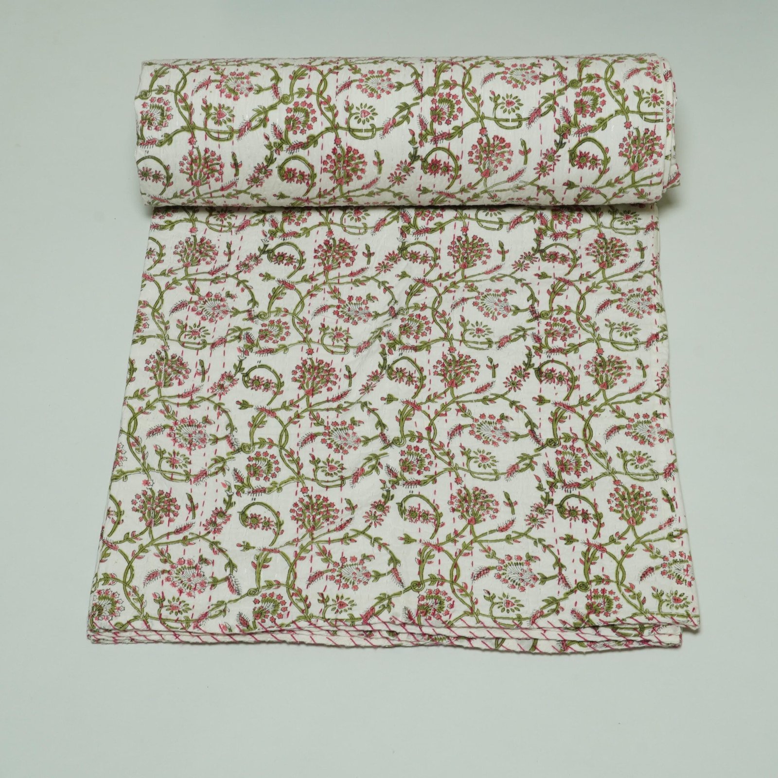 Handmade Floral Kantha Quilt Cotton Block Print Soft Bedspread, cozy, and perfect as a bedspread or decorative throw.