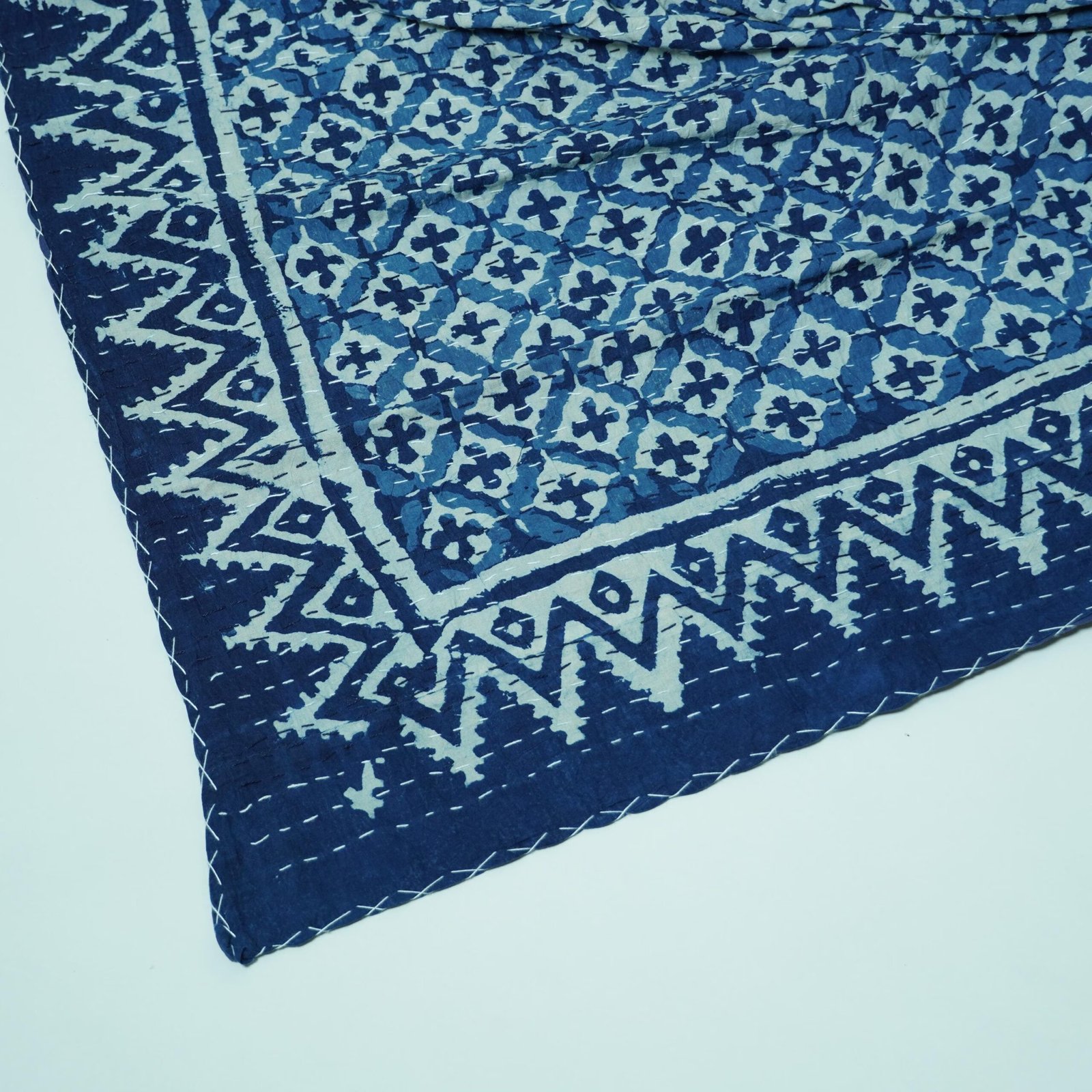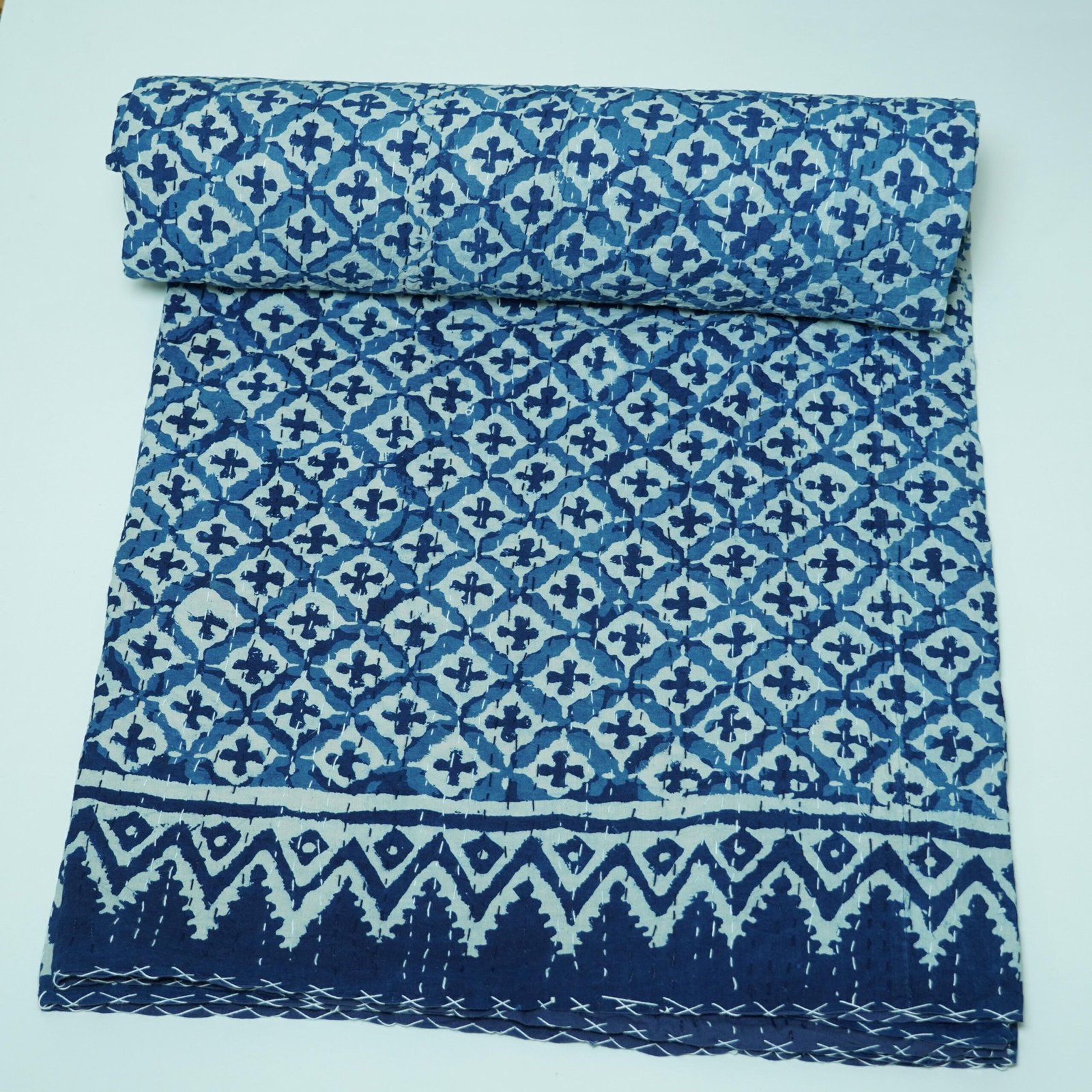 Handmade Indigo Block Print Kantha Quilt in Pure Cotton for Bedroom décor, featuring traditional Indian block printing and hand-stitched Kantha work by skilled Jaipur artisans. Lightweight, breathable, and perfect for everyday bedding or boho home styling.