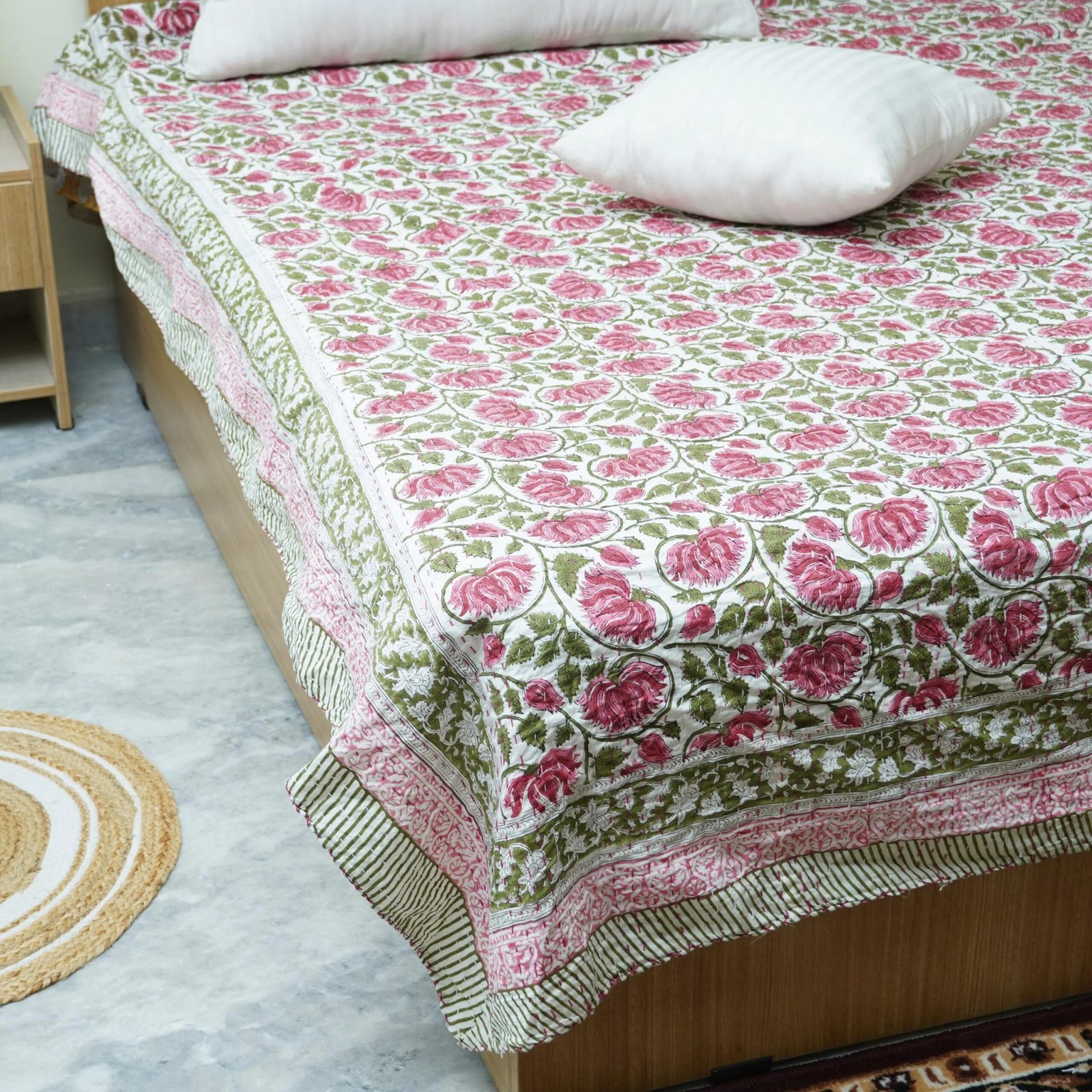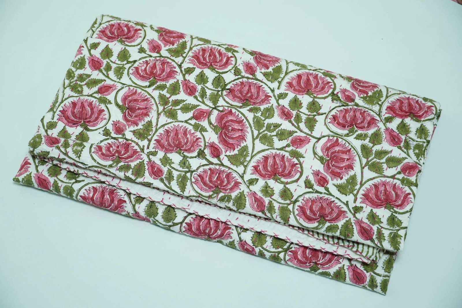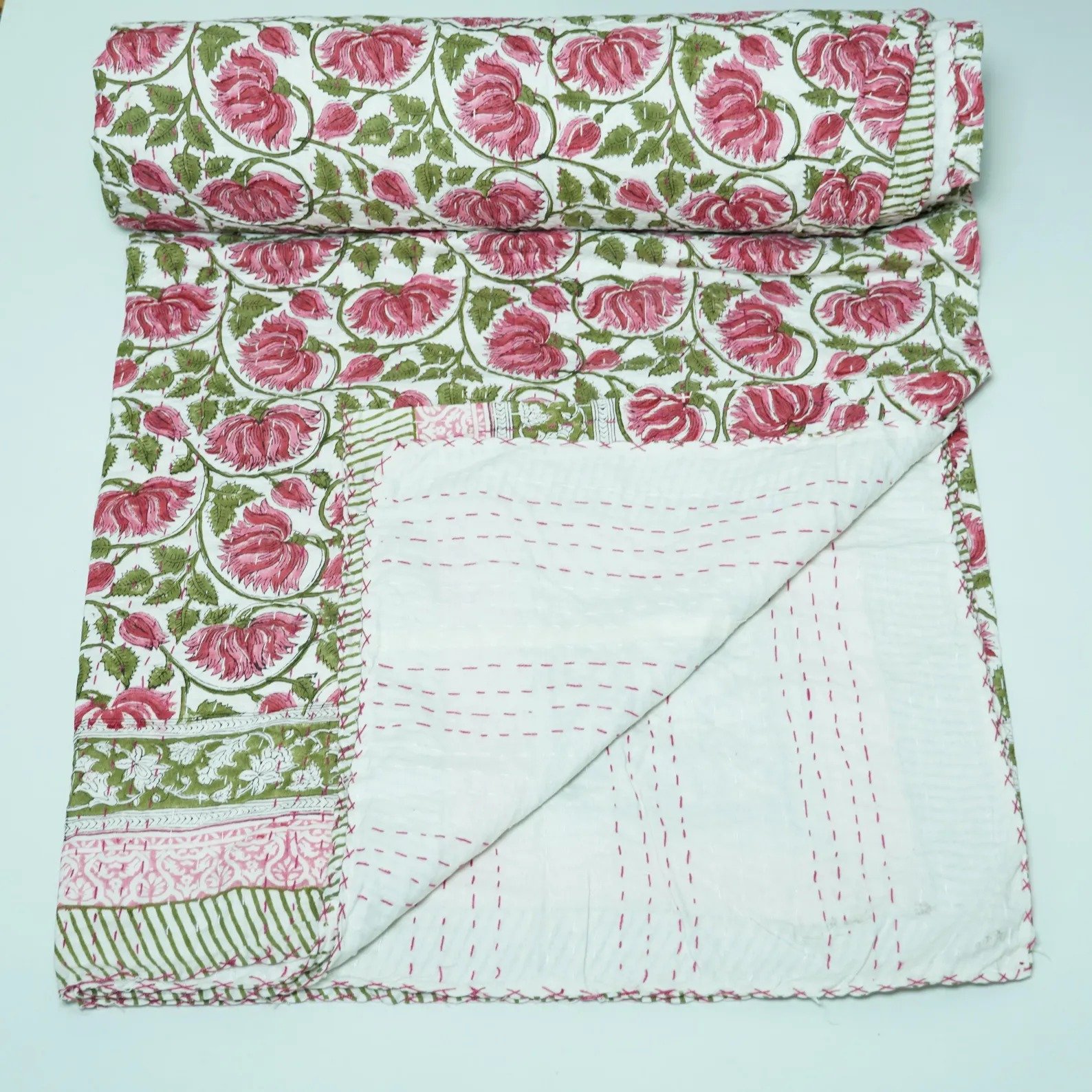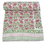 Handmade Pink Floral Block Print Kantha Quilt in Pure Cotton