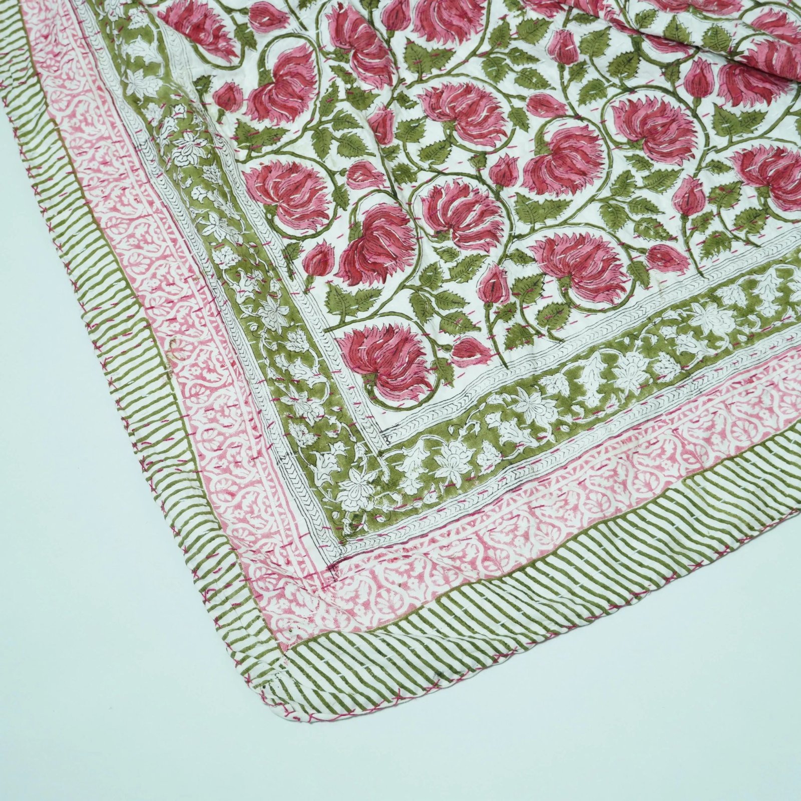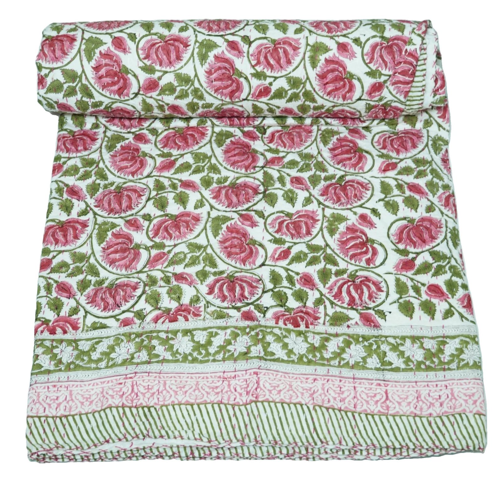 Green Floral Block Print Kantha Quilt– Handmade