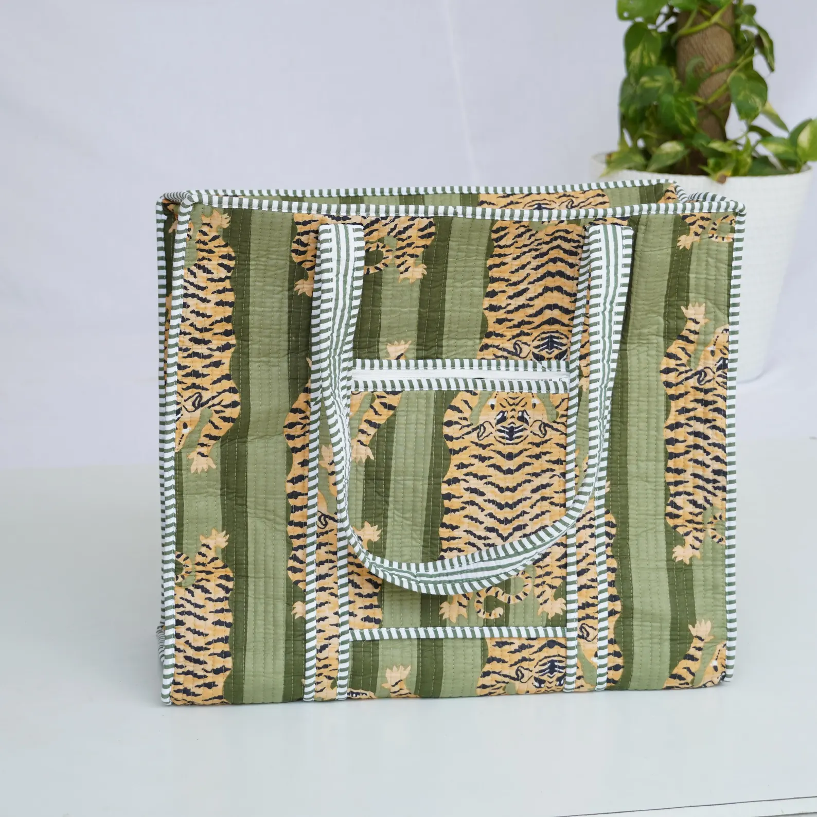 Handmade Tiger Print Quilted Cotton with zipper pockets, spacious and lightweight — perfect for beach trips, gym, grocery runs, or everyday use. Ethically crafted in Jaipur from 100% natural cotton, this eco-friendly tote blends durability, style, and sustainability.