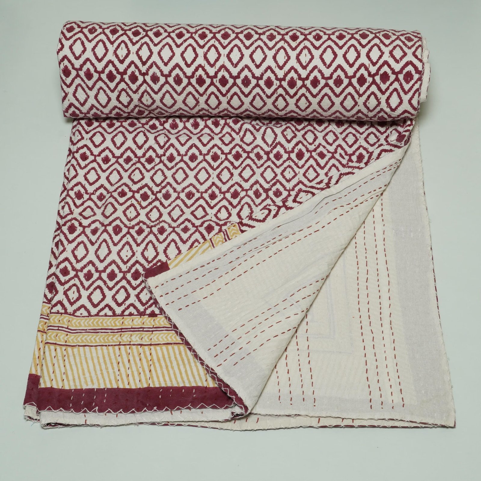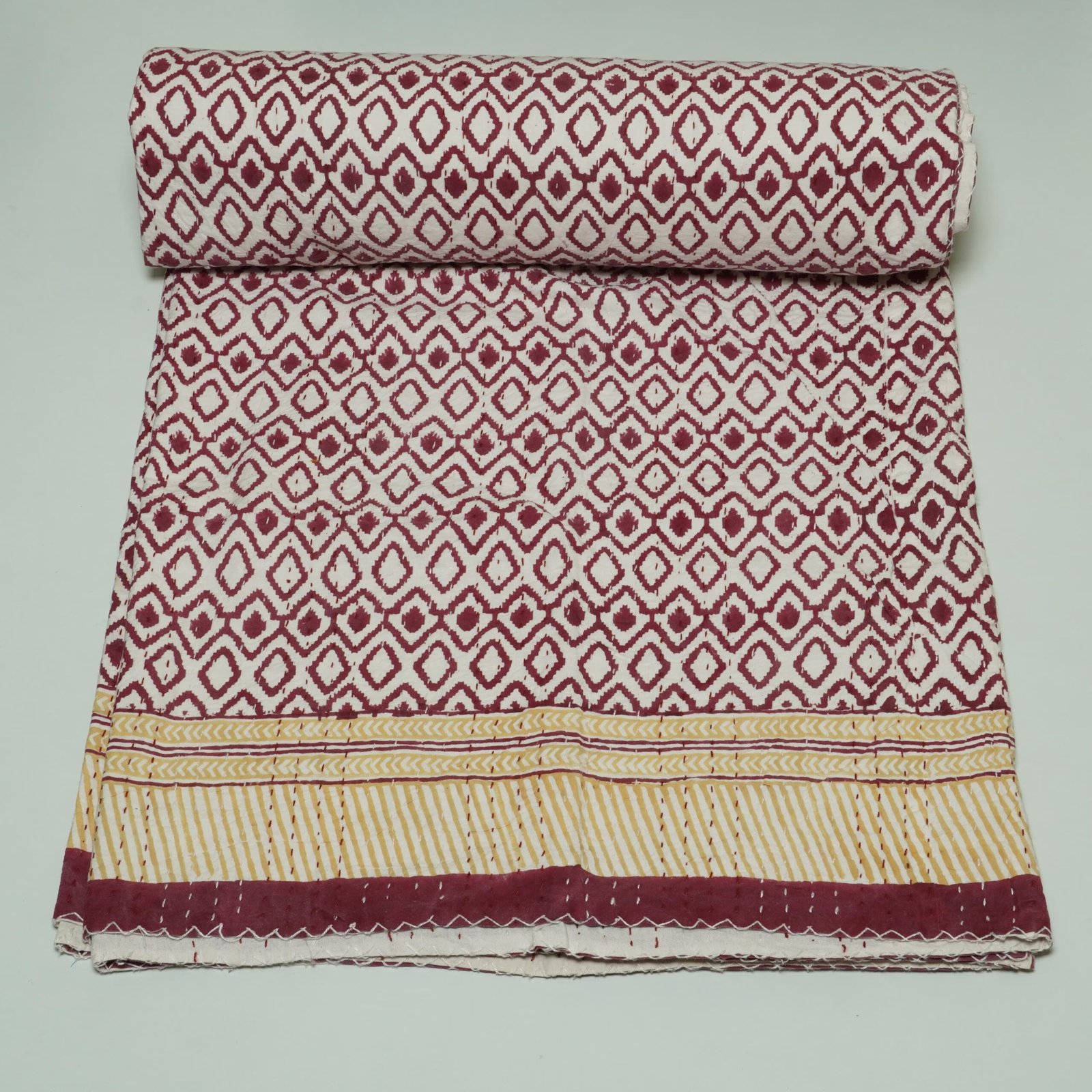Kantha Quilt Maroon Geometric Block Print Handmade Cotton Bedspread with a mustard border, crafted in soft cotton for cozy bedding and stylish décor.