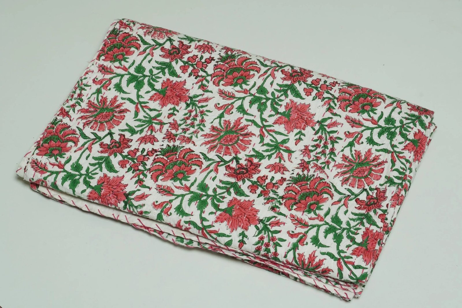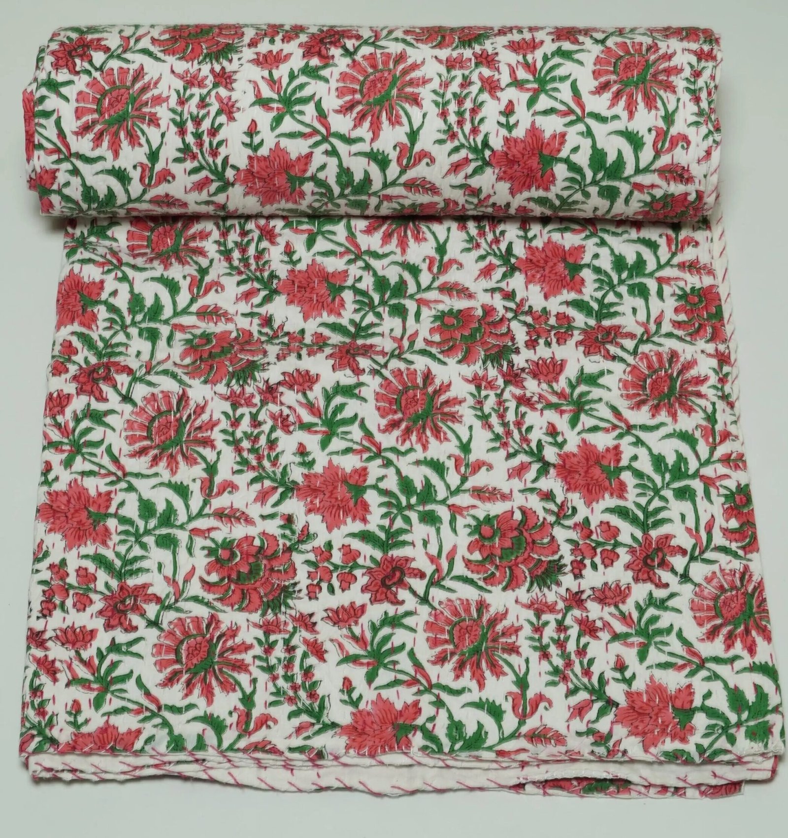 Luxury White Floral Block Print Kantha Quilt – Handmade Pure Cotton Bedspread by skilled artisans using traditional techniques. This lightweight, bedspread features red floral patterns with green detailing on a white base, perfect for comfortable everyday bedding and elegant home décor.