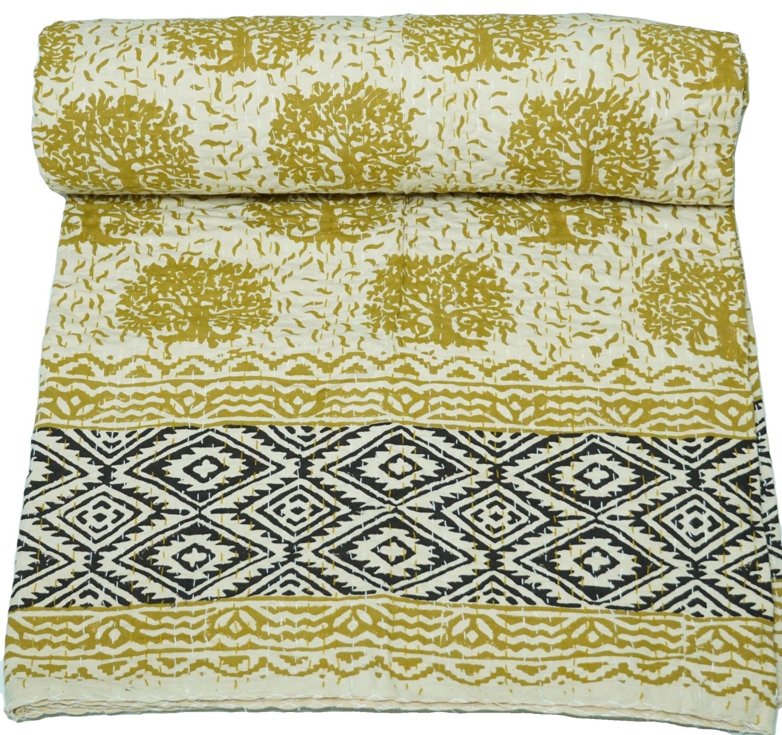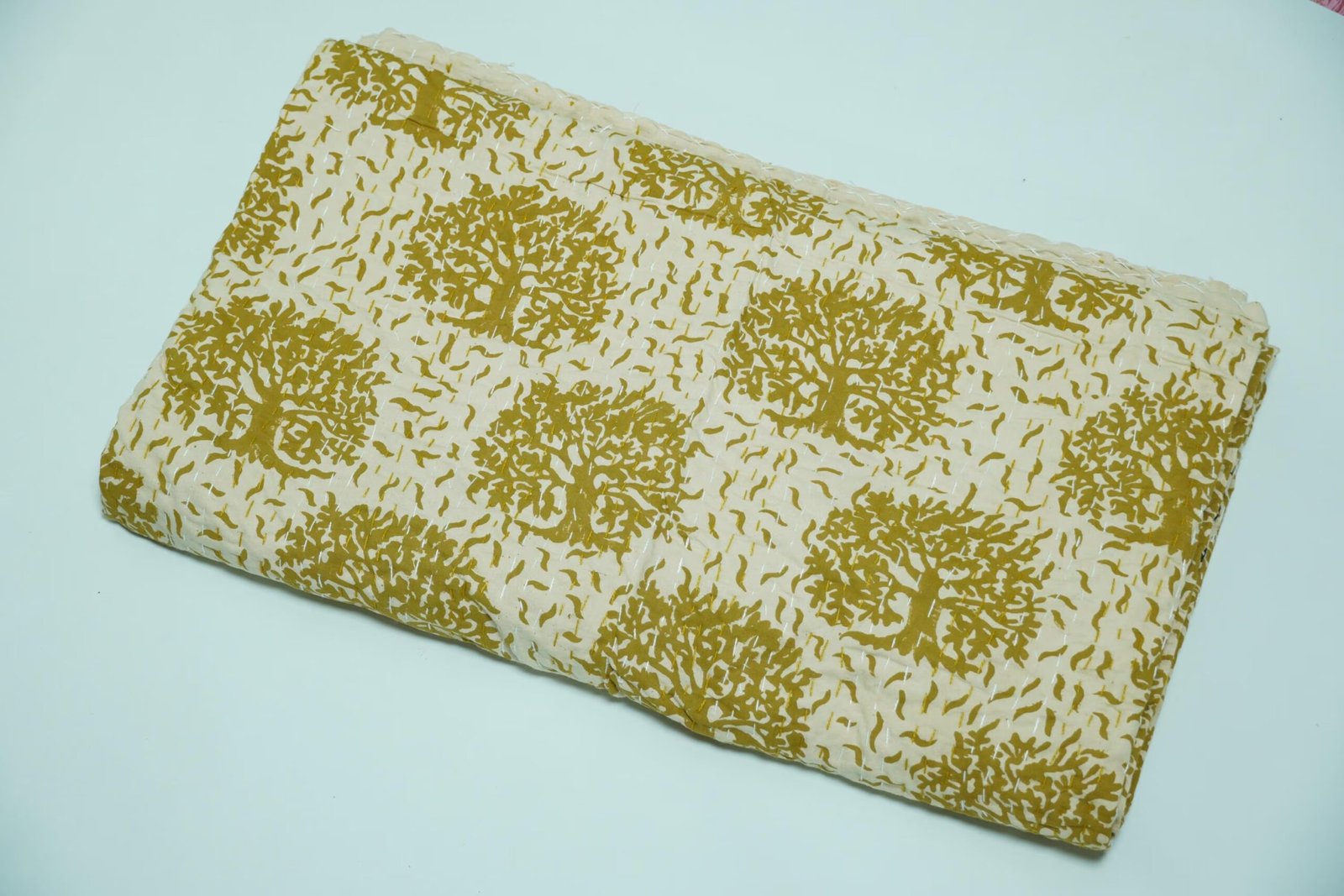 This handmade Kantha quilt features a warm mustard yellow base with traditional tree and geometric block prints on pure cotton quilt. Lightweight, breathable, and hand stitched, it’s ideal for boho, earthy, and modern home decor.
