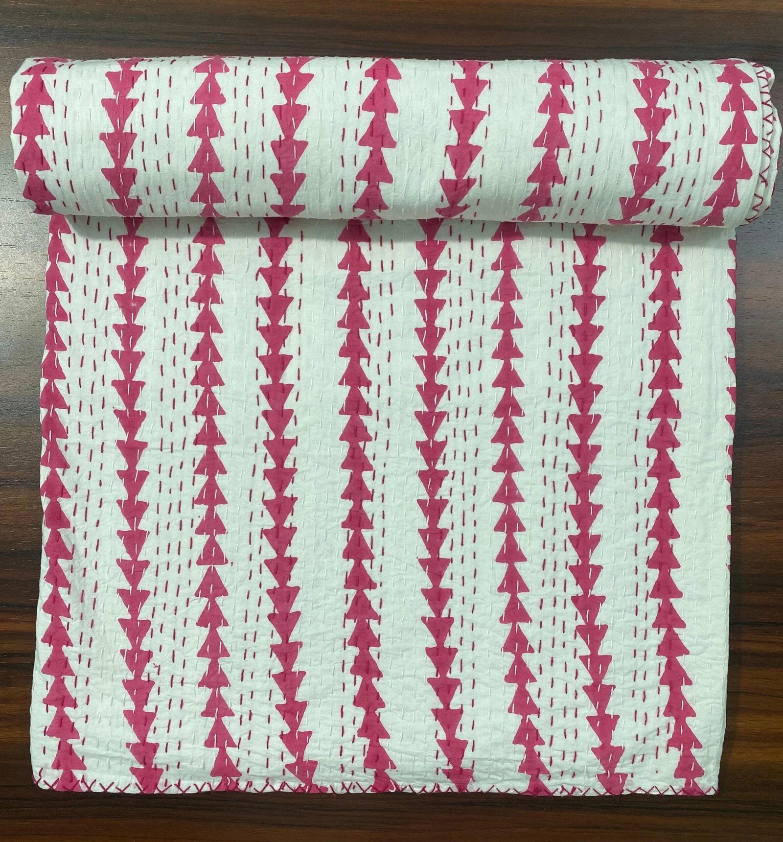 Experience true craftsmanship with our Pink Arrow Kantha Quilt Cotton handmade block print Kantha quilt, beautifully stitched by skilled artisans in Jaipur, India. Each piece is unique, lightweight, and made from 100% natural cotton for year-round comfort.