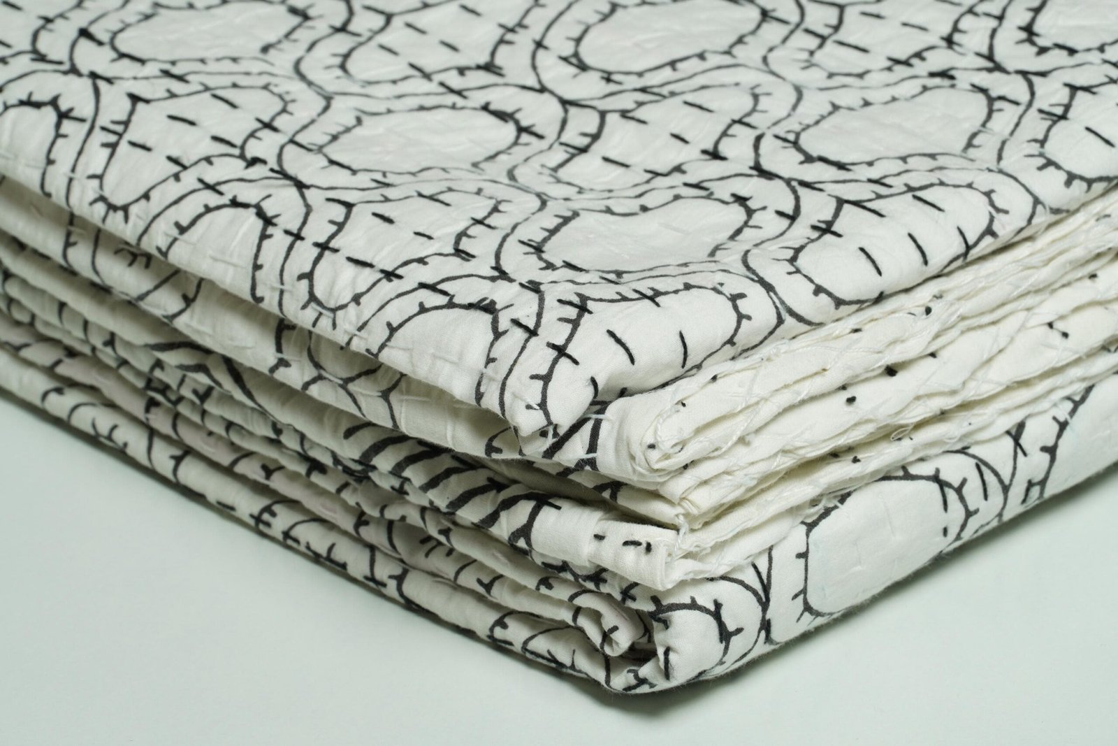White Cotton Kantha Quilt Handmade Black Stitch Boho Bedspread
