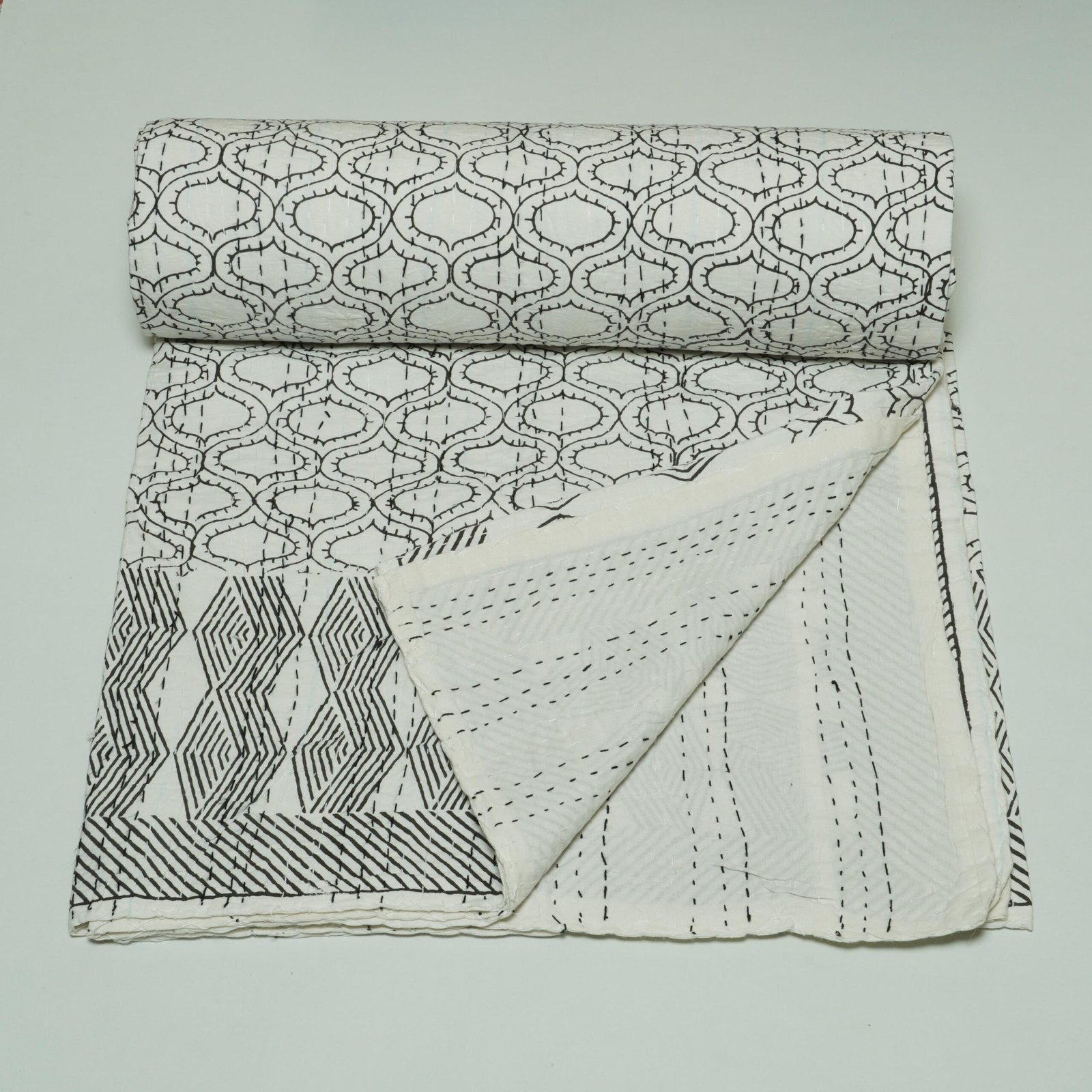 Black White Kantha Quilt Handmade Cotton Block Print Boho Bedspread