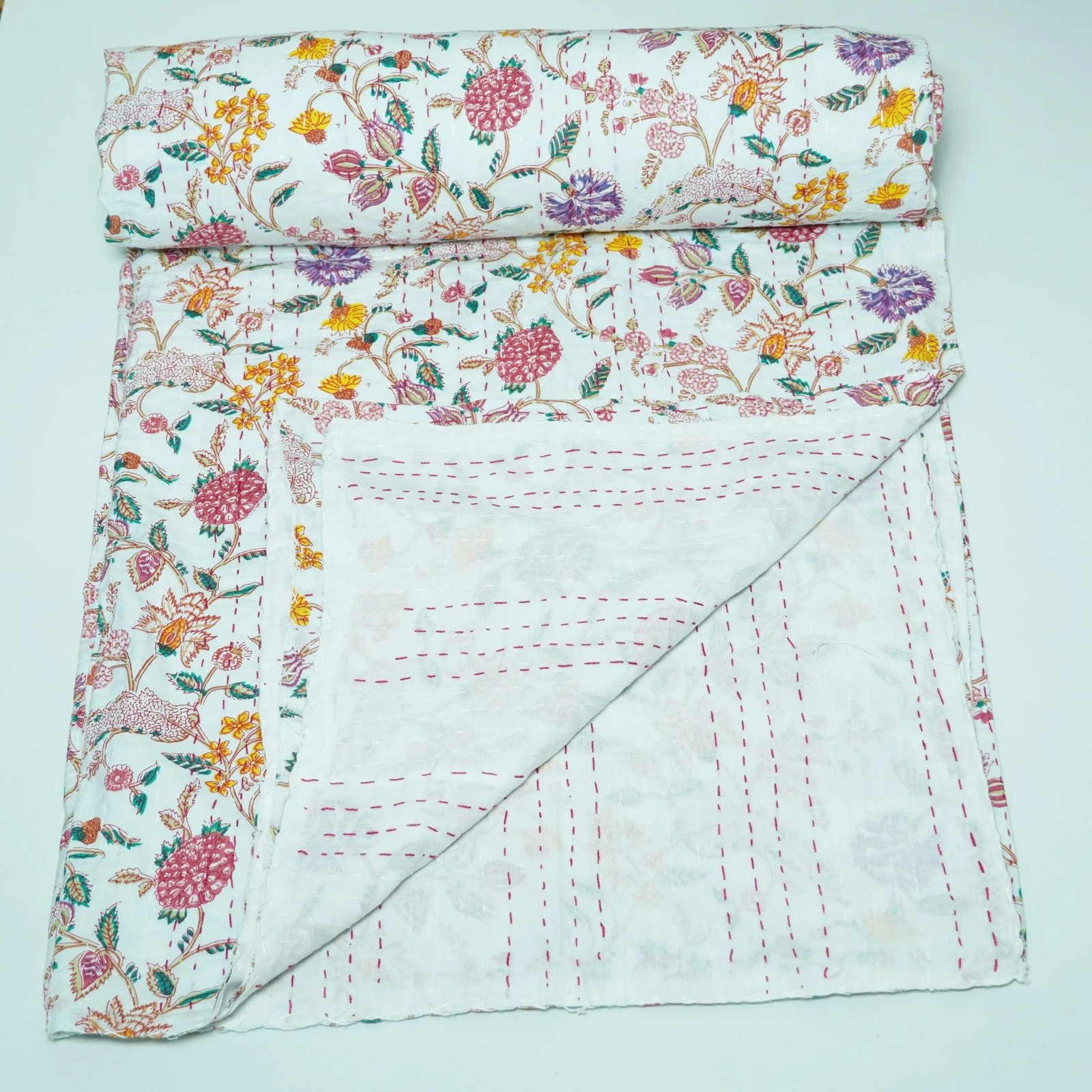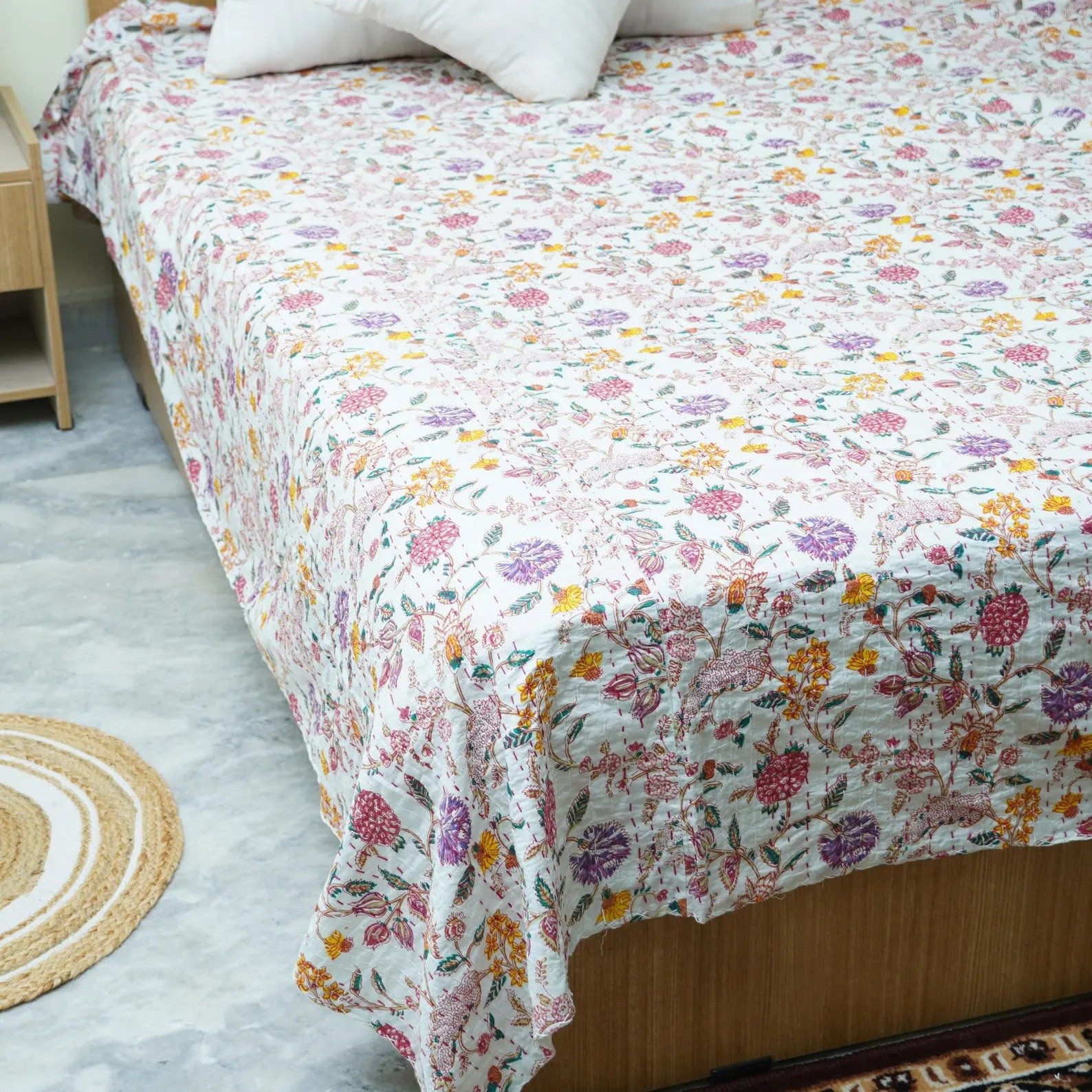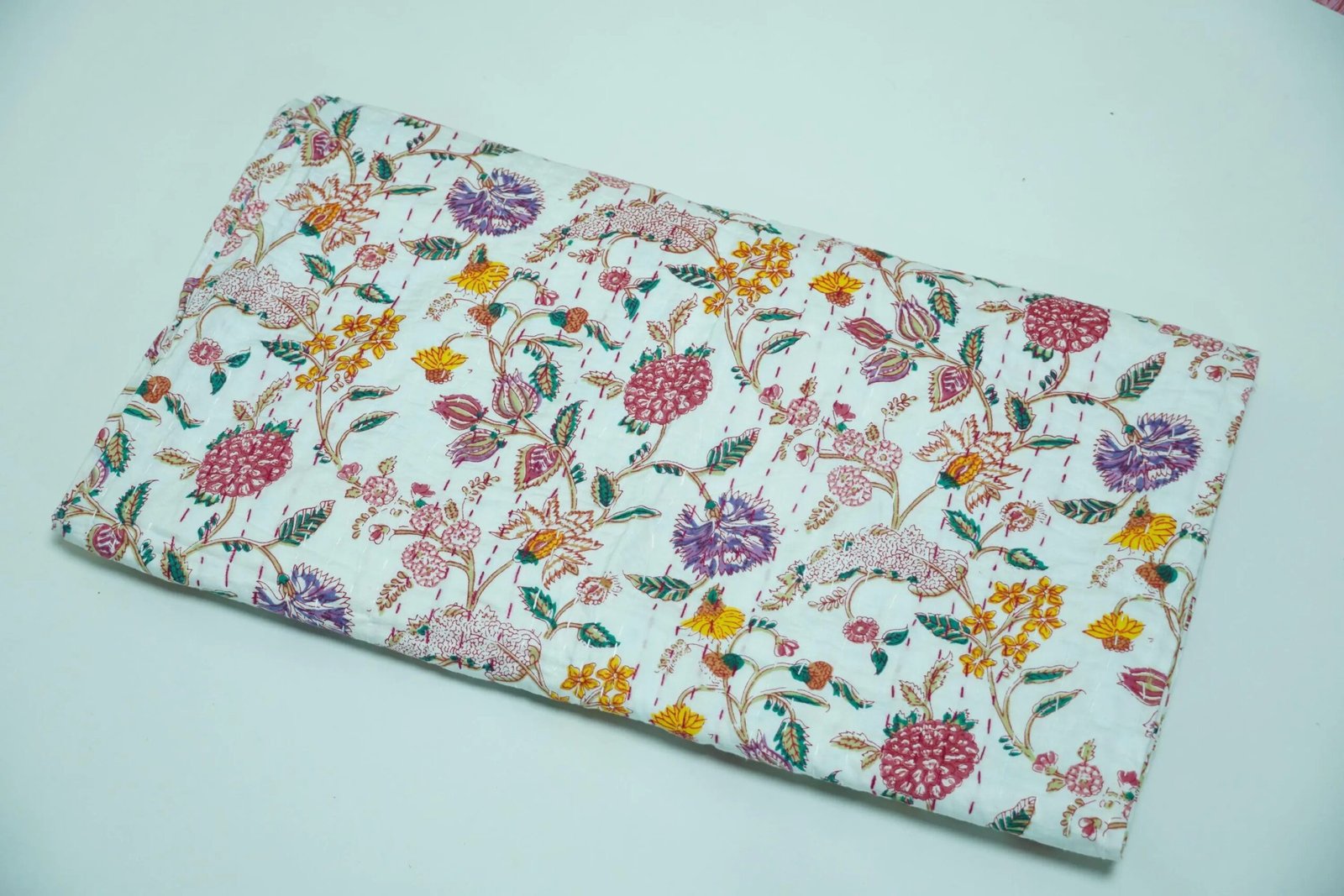 White Floral Block Print | Kantha Quilt Handmade Cotton